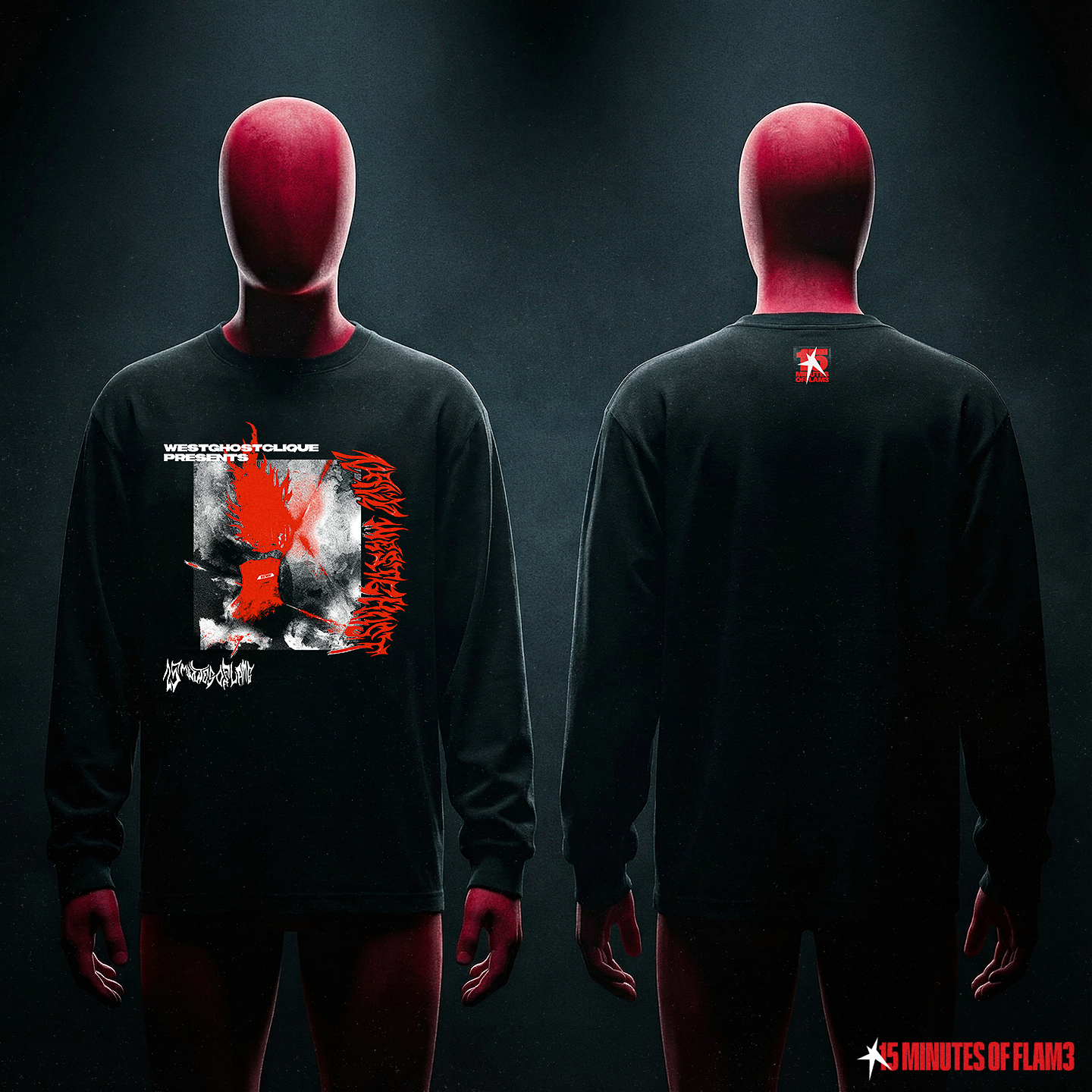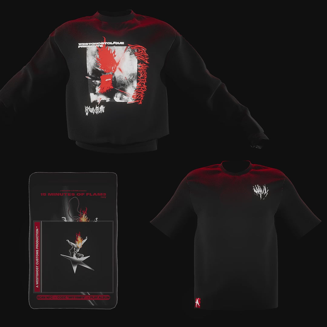 Das 15 MINUTES OF FLAM3 COMPLETE BUNDLE beinhaltet das Shirt sowie das Crewneck-Sweatshirt zum Tape. Das Complete Bundle wird ausgeliefert mit der 15 MINUTES OF FLAM3 NFC KEYCHAIN (Enthält Zugang zu 7 Songs + zukünftige Bonus Songs). Die Bestellung des COMPLETE BUNDLES wird innerhalb von 3 bis 4 Werktagen versendet.